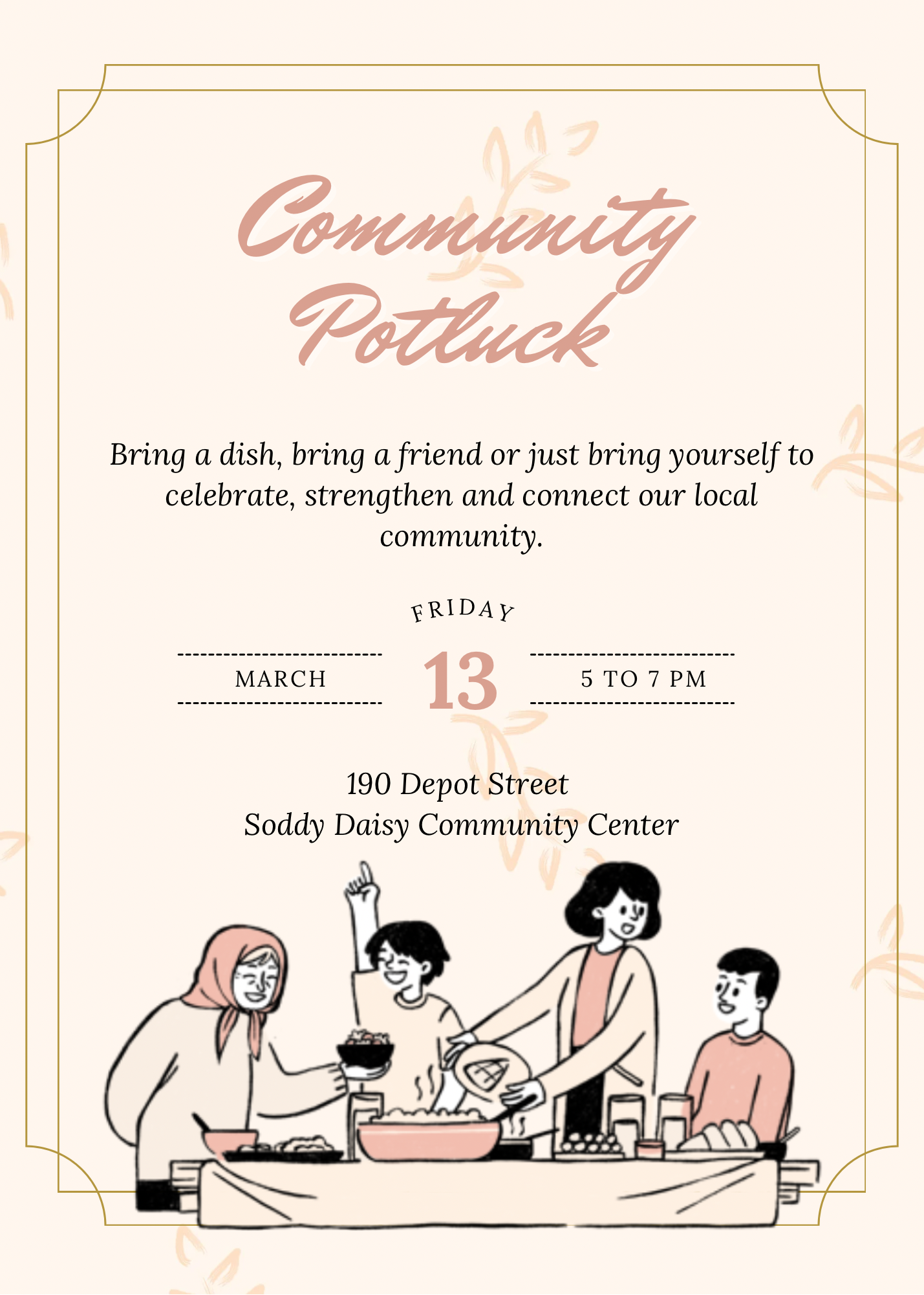 Community gatherings including potlucks and resource sharing sessions designed to bring neighbors together, foster connection, and support one another through shared meals and collective care.